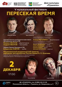Московская областная филармония при поддержке Министерства культуры Московской области и Администрации Пушкинского муниципального района представляет V юбилейный музыкальный фестиваль «Пересекая время». Фестиваль пройдёт 1 и 2 декабря 2018 года в Доме культуры «Пушкино» в рамках проекта «Высокое искусство в малых городах Подмосковья». Художественные руководители фестиваля – заслуженные артисты России Михаил и Андрей Ивановы.