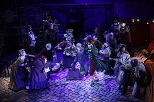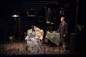 … Стараниями постановщиков сцена на Остоженке превратилась в настоящий парижский Латинский квартал конца XIX века. Романтический дух обителей богемы был передан точными и яркими штрихами. В красных тонах кафе «Момю», где происходит пирушка неимущих творцов, напоминала публике о красных огнях «Мулен Руж» и кафешантанах в районе бульвара Клиши. Печка-буржуйка (вместо прописанного в либретто камина) в скромном жилище главных героев, поэта Рудольфа и художника Марселя, еще более красноречиво свидетельствовала об их неблестящем финансовом положении. Постановщики придумали интересный ход – квартира Рудольфа и Марселя находится не на уровне сцены, а поднята вверх специальным подъемником – прекрасная метафора существования молодых дарований, вечно витающих в облаках. В первом действии Рудольф и Мими поют на этом подъемнике, как два соловья на одной ветке, но смерть от чахотки бедняжки Мими, возлюбленной Рудольфа, в буквальном смысле опускает их на землю.