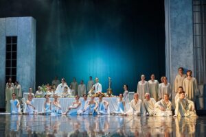 Более того, «Мир» сотворен в стиле лубка, который чаще можно увидеть в зарубежных экранизациях русской классики: некий гламур с самоварами, церковным песнопением, сарафанами, караваями. Кстати, и начинается всё еще с афиши, на которой в чистом поле накрыт стол а-ля русский стиль, за которым сидят, стоят участники действа. Сам балетмейстер выдвинул себя на первый план, повернувшись ко все остальным, так сказать, задом.