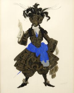 - Бакст Лев Самойлович (1866–1924) «Королевский гвардеец. Мавр.» Эскиз костюма к балету П. Чайковского «Спящая принцесса». 1921 г. Балет в трех актах, пяти картинах с прологом на сюжет сказки Шарля Перро. Хореография Мариуса Петипа и Брониславы Нижинской. Постановка для «Русских балетов» Сергея Дягилева, театр Альгамбра, Лондон, 2 ноября 1921