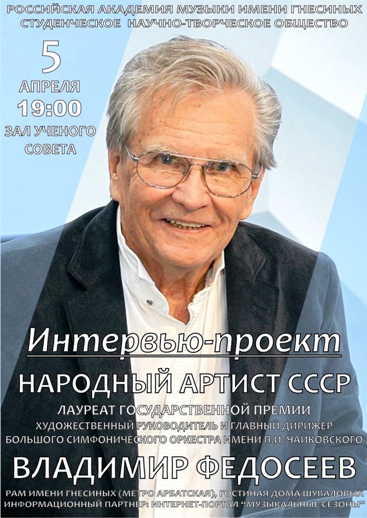 5 апреля в 19:00 в РАМ имени Гнесиных состоится открытое интервью с народным артистом СССР Владимиром Федосеевым Владимир Иванович Федосеев – художественный руководитель и главный дирижер Государственного академического Большого симфонического оркестра имени П. И. Чайковского, с 1997 по 2006 гг. – главный дирижер Венского симфонического оркестра, с 1997 г. – постоянный гостевой дирижер оперного театра […]