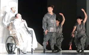 Так же как в балете Петипа самое сильное впечатление производит картина «Теней». Но вместо «белого» балета, являющего собою мир гармонии и духовного покоя, японские гости предложили свой интересный вариант. Над черной сценой висят на ниточках белые листочки, напоминающие тысячу журавликов пострадавшей в Хиросиме девочки Садако Сасаки. Шеренга из двенадцати теней выходит на зрителей шаг за шагом. Никаких красивых поз в виде арабесков. Шаги прерываются остановками с коряво вскинутыми руками – эти стоп-кадры пугают и кричат, как вопли о помощи. Белые одежды словно присыпаны пеплом (художник по костюмам Йосюки Миямаэ). Лица закрыты то ли фатой, то ли вуалью – так и в жизни ходили обезображенные атомной бомбардировкой жители Хиросимы. Эти японские тени не несут упокоения, напротив, они агрессивны. Круги яростно набрасывающихся на Батора теней хореограф сконструировал по образцу «Жизели». Но там виллисы губили неверных мужчин, а здесь они мстят воину (статус военного броско подчеркивает военная форма Батора).