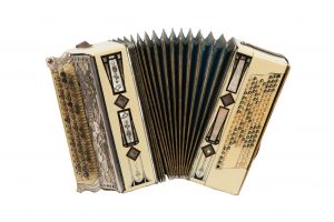 Осенью прошлого года в коллекцию Музея музыки поступил личный баян Якова Федоровича Попкова, участника трио баянистов Мейерхольда, с которым он выступал в период с конца 1940-х по 1958-й. Это очень красивый заказной трехрядный полновыборный баян цвета слоновой кости, изготовлен он на Тульской фабрике баянов; планки и голоса работы мастера Якова Пастухова; ручная отделка выполнена мастером Бочаровым: баян украшен резьбой и инкрустациями перламутром и стеклом. Инструмент подарил Музею Алексей Александрович Попков ‑ внук баяниста.