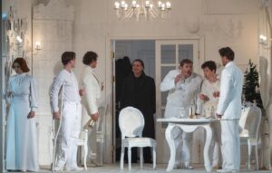 Крымский спектакль – о прекрасном прошлом и черном, туманном будущем. Конечно, не новая, но совершенно эффектная сцена, когда Елена мечется по улице, ища ушедшего, вернее, сбежавшего мужа Владимира Тальберга (Андрей Бронников), и ее буквально кружит метель и вьюга, а под ногами трупы, трупы и трупы. Кстати, в этом белоснежном ансамбле Тальберг единственный одет во все черное. Он здесь чужак и сам хорошо это понимает.