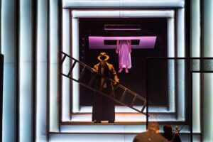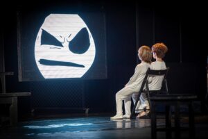 Но главной метафорой оформления (художник-постановщик Наталья Лось) все же стал не балет как символ ускользающей, а возможно, и утерянной красоты, а своеобразный тоннель, этакий ступенчатый портал с лестницей, по которой уходили самоубийцы. Костюмы от пачек до джинсов, берцев и легких плащей работают на образ спектакля. Как и свет Владимира Коваленко, рождающий паузы, тени и нужную атмосферу. Режиссер обыгрывает каждую деталь-символ. Здесь и маленький, почти игрушечный храм на веревочке в углу с кубиками и телевизором, где дети в белом смотрят мистера Фримена. Именно еще не тронутая грязью детская душа читает нам – читает взволнованно, горячо – «Бесов» Александра Сергеевича Пушкина. Этот же ребенок, словно маленький сторож (Гриша Гордейчук), бродит по залу, вглядываясь в его темноту.