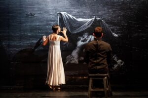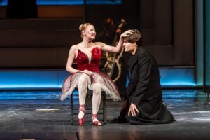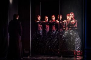 Ставрогин вовсе предстает в двух ипостасях: один с исповедью и мечущийся (Николай Нечаев), другой – фабульный (Петр Котров). Двойничество, двоемирие, что-то вроде «разорванного сознания», внутреннего конфликта, несовместимости идеалов – у Достоевского это один из элементов поэтики, восходящий к эстетике романтизма. Такой же эстетики придерживается и режиссер «Бесов». Несмотря на жесткость рисунка спектакля, порой на взвинченность действия, мы все время улавливаем именно романтическую составляющую. Не зря постановщик ввел в действо виолончель – с ее теноровым регистром, надломом, надсадностью, певучестью, напряжённостью. Даже на легком занавесе видим одну из самых любимых картин Достоевского — «Пейзаж с Ацисом и Галатеей» или «Ацис и Галатея». Картину Клода Лоррена можно рассматривать как тоску о высшей, утраченной гармонии. А на экране – опять же «Лебединое озеро», но не с «умирающей» Галиной Сергеевной Улановой, а именно с мятежной и гордой Майей Плисецкой.