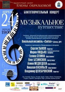 Своё «музыкальное путешествие» в наш город совершат воспитанники Донецкой Республиканской специализированной музыкальной школы-интерната для одарённых детей, призёры Международных музыкальных конкурсов вокальный ансамбль «Cantus». 24 апреля 2017 года в Культурном центре Елены Образцовой состоится благотворительный концерт, в котором примут участие юные музыканты Школы-интерната. Вместе с ними на одной сцене будут выступать профессиональные артисты, лауреаты и дипломанты международных конкурсов Олег Безинских (контртенор), Сергей Зыков (баритон), Мария Людько (сопрано), Владимир Целебровский (баритон), Николай Васильев (фортепиано), Галина Сенина (фортепиано), Алина Медведева (фортепиано). В программе концерта – светская и духовная музыка от эпохи барокко до ХХ века.