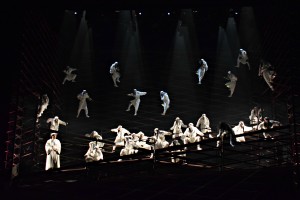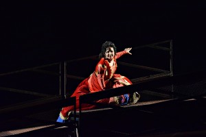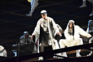 Хор «Геликона» на сей раз не только замечательно поёт, но показывает пластические чудеса, к которым трудно привыкнуть. Хореограф Эдвальд Смирнов может гордиться результатом: замершие в картинных позах на вертикальной решётке тела арабских воинов «в засаде» на прологе (там высота конструкции страшноватая!), ритмично живущие в походном лагере «как бы цыгане», подтанцовка прелестниц-корифеек в быстрой части Каватины Леоноры Di tale amor che dirsi. Особенно удивила сцена в лагере ди Луна. Squilli, echeggi la tromba guerriera – типично вердиевский, песенно-суровый мужской хор. И стройные как на подбор парни в белом складно пели и танцевали, ловко двигая бёдрами на грани приличия под восточными шароварами. Сакрально ясно возвестили из-за кулис знаменитое Miserere. А потом повторили заупокойные строки исламисты в белом, сверх плана, на последней минуте действия, в момент казни. У Верди такого не написано, но получилось.