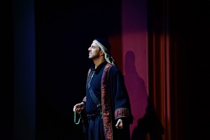 Сложнее всего оценивать заглавного героя. Если учесть, что мы услышали дебют Ивана Гынгазова (не только в партии Манрико, но и вообще на московской сцене) – это зачёт. Молодой, неопытный, учивший партию просто для страховки (подготовлено целых четыре состава солистов!) – и вдруг пришлось выручать театр и заболевшего коллегу. Высокий, худой, русоволосый, похожий на сказочного Иванушку, юноша подошёл фактурно к режиссёрской концепции – Манрико не романтический рыцарь, а пешка в чужой игре, сирота, которым манипулируют по очереди остальные персонажи. Все ноты Гынгазов спел, и пресловутое Di quella pira, стретту, не побоялся в до мажоре прокричать. (Даже многие мастера спокойно поют в си мажоре, на полтона ниже, и есть вариант в си-бемоль мажоре, тоже используется.) Дальше выбегают не его соратники «серо-зелёные», а «белые» арабы и под ликующее All’armi, подняв на руки, уносят Трубадура (он здесь снова в камзоле на фоне занавеса) – в тюрьму, как впоследствии оказывается. А он так сияет, так счастлив! Непонятно, кто в тот момент радовался – глуповатый ближневосточный тенор, не узнавший врагов, или солист «Геликона» Иван Гынгазов, что не дал петуха (близок к тому был, в первом дуэте с Азученой), взял верхнее до, и осталось петь уже не много и не страшно. Голос у новичка громкий, простецкий, прямой, но не раздражающий. Жаль, если продолжит петь в такой крикливой манере, особенно силовые партии, вроде Манрико, – рискует стать хроником у фониатров. Какая-то осмысленность, нюансы в пении, сценическая свобода у Гынгазова пока только в перспективе.