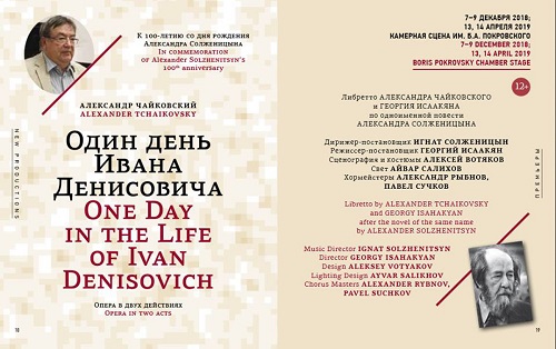 Премьера!!! Большой театр. Камерная сцена им. Б.А. Покровского 7 — 9 декабря 2018 г. К 100-летию со дня рождения Александра Исаевича Солженицына Либретто Александра Чайковского и Георгия Исаакяна по одноименной повести Александра Солженицына Дирижер-постановщик — Игнат Солженицын Режиссер-постановщик — Георгий Исаакян Сценограф и художник по костюмам — Алексей Вотяков Художник по свету — Айвар Салихов Хормейстеры — Александр Рыбнов, Павел Сучков […]