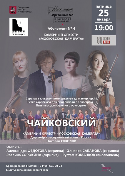 Москонцерт на Пушечной Зеркальный зал 25 января 2019 года 19:00 Исполнители: КАМЕРНЫЙ ОРКЕСТР «МОСКОВСКАЯ КАМЕРАТА» Дирижер — заслуженный артист России Николай СОКОЛОВ Солисты: Александра ФЕДОТОВА (скрипка) Эльвира САБАНОВА (скрипка) Эвелина СОРОКИНА (скрипка) Рустам КОМАЧКОВ (виолончель) В программе: Серенада для струнного оркестра до мажор, ор.48 Pezzo capriccioso, Nocturne для виолончели и струнных Пять пьес для […]