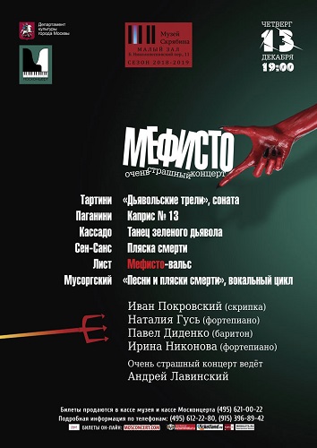 Москонцерт Дом-музей А. Н. Скрябина — Малый зал 13 декабря 2018 года в 19:00 1 отделение — Дж. Тартини — соната соль-минор «Дьявольские трели» 1. Larghetto 2. Tempo giusto della scuola tartinista 3. Andante — Allegro — Adagio — Н. Паганини — Каприс № 13 — Г. Кассадо — Танец зеленого дьявола — К. Сен-Санс — Пляска смерти, ор.40 […]
