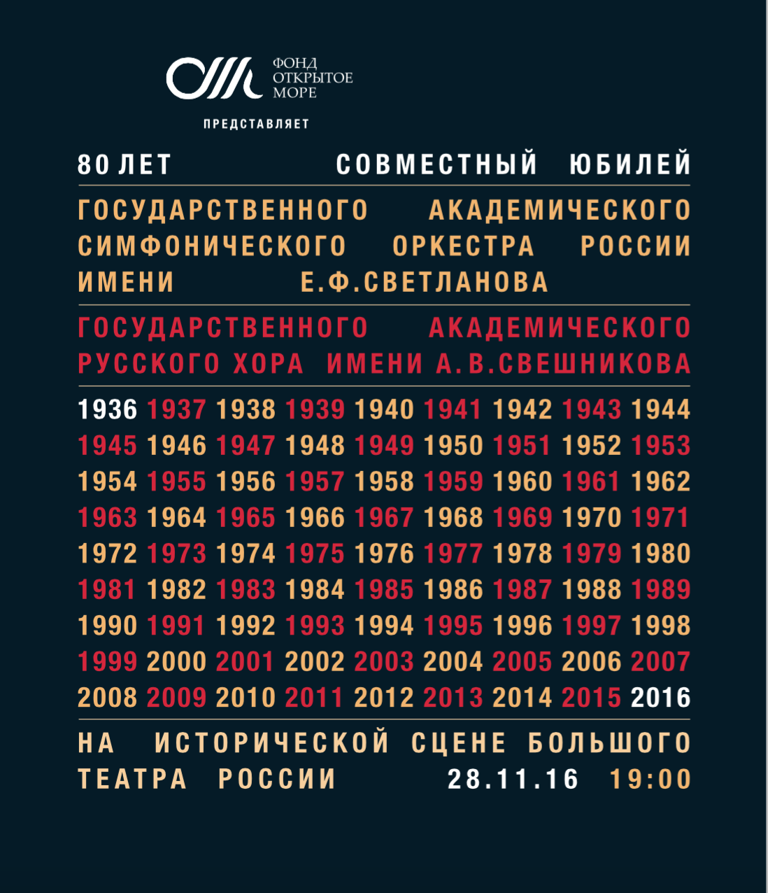 Фонд культурных и образовательных программ «Открытое море» представляет объединенный юбилейный концерт, посвященный 80-летию основания Госоркестра России им. Е.Ф. Светланова и Госхора им. А.В. Свешникова Историческая сцена Большого театра 19.00 Режиссер-постановщик – Юрий Лаптев Художник-постановщик – Арсений Эпельбаум Художник по свету – Айвар Салихов Художественный руководитель Госоркестра России им. Е.Ф. Светланова – Владимир Юровский Художественный руководитель […]