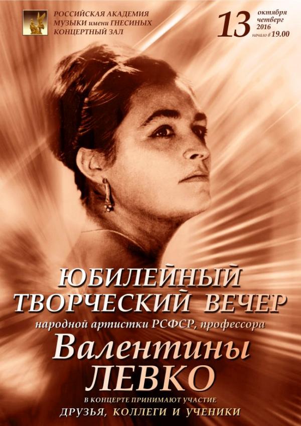 Российская академия музыки имени Гнесиных Большой зал Начало 19.00 13 октября в Большом концертном зале Российской академии музыки имени Гнесиных состоится праздничный концерт, посвященный 90-летнему юбилею выдающейся оперной певицы Валентины Левко. «Она является певицей экстра-класса. Среди меццо-сопрано русской школы, которые зачастую тяготеют к резкой, напряженной манере пения, она обладает прекрасно округлым, роскошным голосом с глубоким тембром и безукоризненной […]