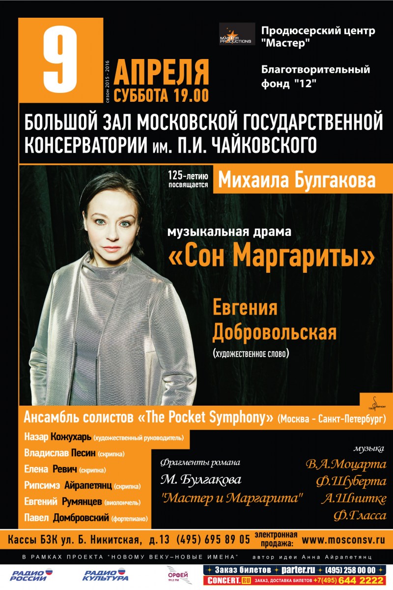 Московская государственная консерватория им. П.И. Чайковского Большой зал 9 апреля 2016 года Начало 19.00 Музыкальная драма «Сон Маргариты» по роману М. А. Булгакова «Мастер и Маргарита» В программе: В. А. Моцарт Ф. Шуберт А. Шнитке Ф. Гласс Н. Кейдж Исполнители: Евгения Добровольская Ансамбль солистов «The Pocket Symphony» Дирижер – Назар Кожухарь Роман «Мастер и Маргарита» – последнее и самое таинственное […]