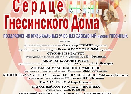 Концертный зал РАМ им. Гнесиных Малый Ржевский переулок, д.1 26 марта. 19:00 Концерт, посвященный 50-летию со дня основания Мемориального музея-квартиры Ел. Ф. Гнесиной. КУПИТЬ БИЛЕТ »» Музей-квартира Ел.Ф. Гнесиной – это единственный в Москве мемориальный музей, расположенный в здании высшего учебного заведения. И один из очень немногих музеев где полностью сохранена прижизненная обстановка […]