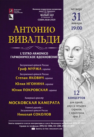 Москонцерт представляет Московская Консерватория Малый зал 31 января 19:00 Исполнители: Заслуженный артист России Граф МУРЖА скрипка Юлия ИГОНИНА скрипка Юлия ПОКРОВСКАЯ скрипка Камерный оркестр «МОСКОВСКАЯ КАМЕРАТА» Приглашенный гость – Заслуженный артист России Степан ЯКОВИЧ В программе: А. Вивальди 12 концертов для одной, двух и четырёх скрипок с оркестром, соч. 3 L’Estro Armonico или […]