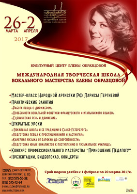 C 26 марта по 2 апреля в Культурном центре Елены Образцовой в Санкт-Петербурге состоится Международная творческая школа вокального мастерства Елены Образцовой, основанная великой русской певицей в 2005 году с целью совершенствования мастерства молодых певцов и обмена опытом работы между преподавателями вокала, певцами, концертмейстерами. Впервые в рамках Школы Елены Образцовой пройдет Открытый конкурс профессионального мастерства преподавателей […]