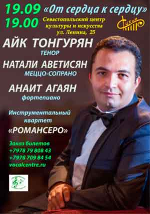 19 сентября на сцене Севастопольского центра культуры и искусства (ул. Ленина, 25) состоится выступление Айка Тонгуряна. В исполнении солиста Национального Академического театра оперы и балета имени А. Спендиаряна (г. Ереван) прозвучат арии из опер Пуччини, Верди, Сен-Санса, Бизе, неаполитанские песни, романсы Рахманинова, Римского-Корсакова, сообщает «Культурный Севастополь». В концерте также примут участие лауреат международных конкурсов, меццо-сопрано […]