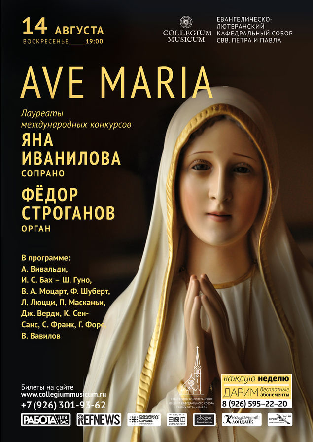 14 августа в Кафедральном Соборе свв.Петра и Павла в исполнении выдающейся российской камерной певицы Яны Иваниловой прозвучат различные интерпретации знаменитого текста «Ave Maria». В ансамбле с Яной Иваниловой выступит прекрасный органист, лауреат международных конкурсов Фёдор Строганов. В программе: A. Вивальди, И. С. Бах – Ш. Гуно, В. А. Моцарт, Ф. Шуберт, Л. Люцци, П. Масканьи, Дж. Верди, К. Сен-Санс, С. Франк, Г. Форе, В. Вавилов Ave Maria […]