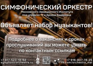 Симфонический оркестр Московского Авиационного института п/у Арсена Бадерхана приглашает в свои ряды студентов и выпускников музыкальных школ, училищ и ВУЗов. В Симфонический Оркестр МАИ требуются музыканты на следующие места: Гобой, 2-й голос; Английский рожок; Валторны 1, 2, 4 голоса; Первые скрипки — 2 места (Концертмейстер, место в группе); Вторые скрипки — 2 места (места в […]