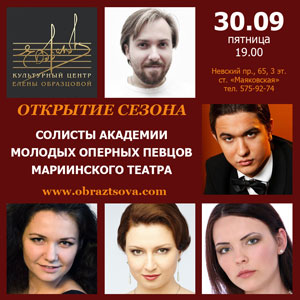 Культурный центр Елены Образцовой открывает сезон 30 сентября в 19.00 концертом солистов Академии молодых оперных певцов Мариинского театра. В программе концерта «Opera Gala» – арии и дуэты из опер русских и зарубежных композиторов. Исполнители – Григорий Чернецов (баритон), Наталья Часовитина (сопрано), Николай Стацюк (тенор), Анна Сарапениа (сопрано), Екатерина Дадайкина (сопрано). Академия молодых оперных певцов Мариинского […]