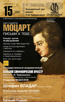 15 мая в 14:00 в Концертном зале им. П. И. Чайковского состоится заключительный концерт цикла БСО им. П. И. Чайковского «Моцарт. Письма к тебе», посвященного 260-летию со дня рождения великого австрийского композитора. В нем, что символично, в качестве пианиста и дирижера выступит соотечественник Моцарта — Штефан Владар (Австрия). В третьем концерте цикла прозвучат увертюра к опере «Милосердие Тита», увертюра к […]