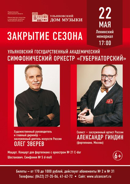 22 мая в 17.00 в Большом зале Ленинского мемориала состоится закрытие концертного сезона Ульяновского государственного академического симфонического оркестра «Губернаторский» под управлением художественного руководителя и главного дирижера – заслуженного деятеля искусств России Олега Зверева. Гостем программы станет заслуженный артист России Александр Гиндин (Москва). В программе: Вольфганг Амадей Моцарт (1756 — 1791). Концерт для фортепиано с оркестром […]