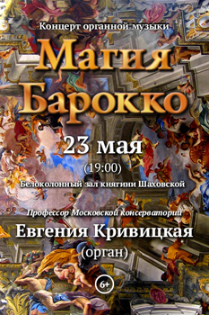 Известная органистка, профессор Московской консерватории Евгения Кривицкая и солисты театра «Геликон-опера» приглашают любителей стариной музыки на концерт «Магия Барокко», который состоится 23 мая в Белоколонном зале княгини Шаховской. В программе концерта – фрагменты из оперных шедевров XVII-XVIII столетий: «Юлий Цезарь в Египте», «Ринальдо» Генделя, «Ксеркс» Бонончини, «Тигран» Вивальди, «Дидона и Эней», «Король Артур» Перселла…