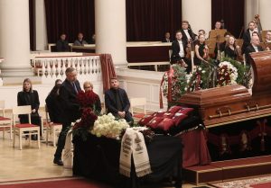Над сценой на фоне органа установили портрет дирижера. На бархатных атласных подушках у гроба были выложены российские и зарубежные награды музыканта.