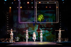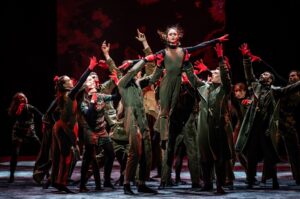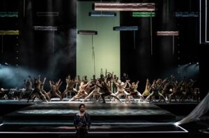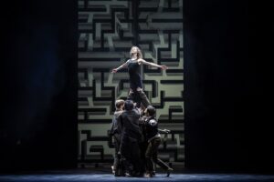 На центральном экране лабиринт. Четыре танцовщика, похожих на брутальных спецназовцев, по содержанию олицетворяющих всадников Апокалипсиса – Голод, Войну, Чуму и Смерть. Они, как внезапно нагрянувшая беда. Смена картины. Гламурные балеринки, цокающие по подиуму пуантами, демонстрируют пестроватые оттепельные наряды. Их пронзительные визги приветствуют парней-моделей. Один из них – парниша-мачо, тоже фланирует на пуантах. Эта сцена звучит как воспоминание героини (Матери) о ее прошлом в мире моды. В дуэте девушки (Модели) и юноши (Кутюрье) соединяется прошлое и будущее, появляется надежда на то, что для героини пройдут темные времена.
