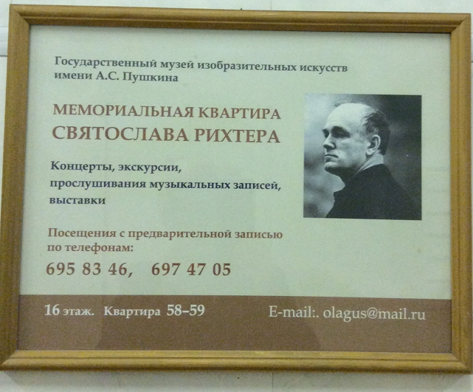 В Москве квартира, где Рихтер провёл последние почти тридцать лет своей жизни, находится в доме № 2/6 по Большой Бронной улице. Музей-квартира Святослава Теофиловича входит в состав Государственного музея изобразительных искусств имени А. С. Пушкина, очень внимательные сотрудники поддерживают в ней прекрасный порядок и трепетно заботятся о состоянии всех экспонатов. Я иногда бываю в этих стенах: в самом большом помещении музея проходят интереснейшие концерты, на которых выступают замечательные музыканты, и не только нашей страны. Позже мы поговорим о том, какую программу приготовили сотрудники музея Рихтера к новому сезону, а сейчас — прошу вместе со мной войти в дверь квартиры № 58-59 и окунуться в атмосферу, окружавшую великого пианиста. Научный сотрудник музея Надя Игнатьева проведёт для нас интереснейшую экскурсию. Постараюсь вкратце передать её рассказ.