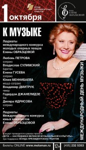 1 октября 2018 года в Международный день музыки Московская государственная филармония отмечает концертом лауреатов вокальных конкурсов Елены Образцовой на сцене Концертного зала им. П. И. Чайковского.