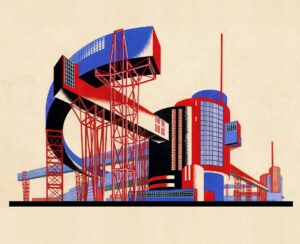 Фантастическая композиция организации пространства сложных по форме и сочетанию элементов сооружения № 28 из цикла Архитектурные фантазии, 1929 — 1932, Архитектурный благотворительный фонд имени Якова Чернихова
