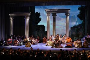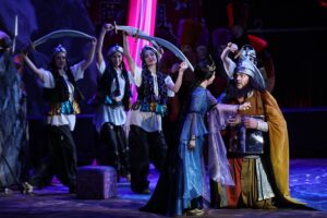 Хор и Детский хор Мариинского театра отличились безупречной интонацией и гармоничным звучанием, в то время как оркестр Мариинского театра под управлением маэстро Валерия Гергиева разразился в отдельных сценах необычайно стихийным и многокрасочным tutti, сменяемым шелковистым диминуэ́ндо и чарующей акварелью созвучий обряда в храме Таниты.