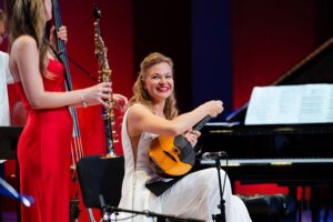 На таком празднестве мелодии и импровизации, как на заключительном джазовом концерте, я присутствовала впервые. Соединение классики и джаза всегда интересно. В этот раз на сцене вместе оказалась не только сам маэстро, но и Андрей Иванов (контрабас), Александр Зингер (ударные), Борислав Струлёв (виолончель), Екатерина Мочалова (домра), Софья Тюрина (саксофон) Тимофей Телешёв (ударные) – финалист конкурса «Синяя птица».