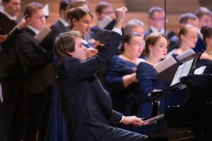 Первое отделение праздничного вечера было выдержано в сосредоточенных тонах. Программу открыли песня Юрия Фалика на стихи Александра Пушкина «Бог помочь Вам» и духовный концерт Сергея Рахманинова «В молитвах неусыпающую Богородицу». С первых же аккордов музыка создала особое пространство — тихое, светлое, предназначенное для внутренней молитвы. Звучание было настолько сконцентрированным и собранным, что, казалось, погружало в себя всех присутствующих: хор и зал будто замерли в одной точке, существуя внутри музыки.