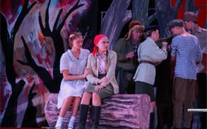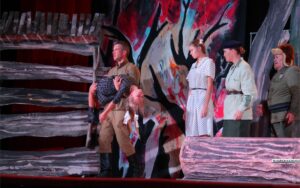 Режиссер разделил действо на две части – реальную и сны. Именно через сны мы узнаем о тех трагедиях, которые пережил каждый герой. Сон сочинен в фантастическом, фантасмагорическом ключе. Каждый рассказывает свою историю про тот ад, который пришлось увидеть. Историй много, все они страшные и кровавые, ведь война не щадит никого. Кто-то прошел через концлагерь, кто-то, несмотря на юный возраст, был вынужден и убивать. Сны раскрашены в красное и черное. Художник Кирилл Еремин показал цвета крови и обугленных головешек, то, что остается после пожара. Его мир – это чистилище, жуткий черно-багровый котлован.