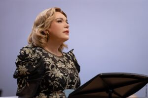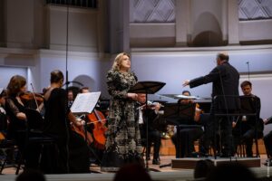 К Екатерине Семенчук вопросы совсем иного плана — мы знаем о ее прекрасных возможностях, большом, сильном и объемном голосе, ярком актерском даре. Но здесь сложилось впечатление, что артистке это сочинение стилистически не очень подходит: хоть она и пыталась петь лирическим звуком, мягко, интимно, использовала много пиано и пианиссимо, но вместе с тем ощущалось определенное напряжение…