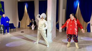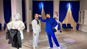Сам же «Торикос» еще постоянно решает проблему помещения. Спасибо греческому культурному центру города Геленджика, любезно предоставившему свою площадку, где и состоялась премьера. Понятно, что это не театральное пространство, но директор театра Андрей Слюсаренко и главный режиссер Анатолий Слюсаренко сумели так грамотно обжить территорию и показать свою легкую, изысканную шутку, что ты просто-напросто забываешь о всех неудобствах и полностью погружаешься в спектакль, кажется, о нашей действительности.