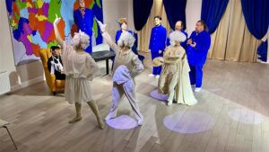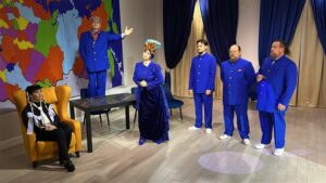 Балетмейстеры Жанна Афонина и Дарья Репина изящно наполнили пластическим дыханием спектакль, сделав всё естественно и точно. Художник Игорь Капитанов и, я полагаю, сам режиссер-постановщик одели своих героев еще и с юмором: чего только стоит на Её превосходительстве кокошник с турнюром, ярчайший шарф на Мухоморове и френчи синего цвета, кстати, кажется, нынешнего любимого цвета наших чиновников. И надо отдать должное работникам ателье «Модный рай» Кати Калининой, умеющим шить мастерски, ведь театральный костюм имеет свои особенности и тонкости.