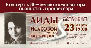 23 марта в 19.00 в Московском доме композиторов состоится Гала-концерт, посвящённый замечательной пианистке, композитору и педагогу Аиде Петровне Исаковой (1940-2012).