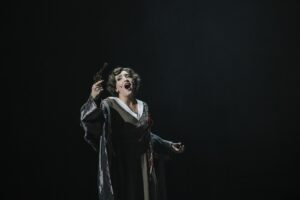 Другой лик спектакля – светлый, лёгкий, чуть с долей слащавости – кружевная завеса в стиле ручного плетения с иконой Божьей матери, с куполами, с просвечивающей зеленью. Это лик родной деревни, постоянного собеседника поэта в диалоге с землей, природой, со своим отрочеством, с матерью, вернее, ее нематериальным образом.