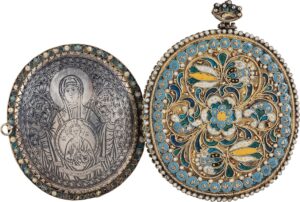 Ювелиры разрабатывали новую технику, в том числе и работы с эмалью. Особый интерес на выставке представляет крест-мощевик, подаренный Петром I своему секретарю А.В. Макарову, заведовавшему ценными бумагами. На оборотной стороне креста, внизу, выгравированы 15 имен святых. В изготовлении же подобного украшения применены различные техники работы с эмалью.