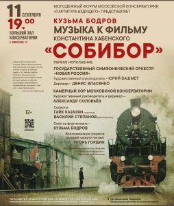 Важным событием музыкальной жизни Москвы станет открытие Молодёжного форума Московской консерватории «Партитура будущего». В этот вечер — 11 сентября 2019 года — в Большом зале консерватории Государственный симфонический оркестр «Новая Россия» под управлением известного дирижёра Дениса Власенко и Камерный хор Московской консерватории под руководством профессора Александра Соловьёва исполнят музыку Кузьмы Бодрова к фильму Константина Хабенского «Собибор». В концерте примет участие заслуженный артист России Игорь Гордин, который прочтёт отрывки из воспоминаний узников лагерей смерти. Примечательно, что публика сможет не только услышать сочинение одного из самых одарённых композиторов современности, но и помочь подопечным Благотворительного фонда Константина Хабенского — часть средств от продажи билетов будет передано детям с онкологическими заболеваниями.