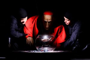 Вокруг аквариума попеременно колдуют образины Великого инквизитора – куклы в обличье кардинала, диктатора, политика-шоумена. Всё это личины одного и того же человеческого типажа, который всегда знает, как лучше, не предоставляя никому кроме себя свободы выбора. Кукла и человек выступают вместе, единым напором и смыслом (браво актерам!) так, что сложно концентрироваться на тексте. Тем не менее, ты концентрируешься не только на нём, но и черно-белых экранах сверху, где копошится, бредёт, шагает стройными рядами толпа, которой необходим пастух. Но пока жив Тот, кто дал людям возможность выбирать, не всё потеряно.