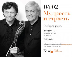 Галерея Нико приглашает Вас 04/02/2018 в 19.00 на концерт Лауреата Международных конкурсов Рустама Комачкова (виолончель) и Заслуженного артиста России Алексея Гориболя (фортепиано) «МУДРОСТЬ И СТРАСТЬ»: