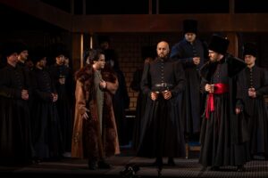 Приглушить, по собственным словам, режиссер собирался тему опричнины и самодержавной власти. Дескать, опричники – всего лишь «сослуживцы главного героя», спектакль прежде всего – «о людях и их страстях», а сама эта история для него – «вневременная, но очень русская». В чем, однако, заключается эта самая вневременность? Не в том же ведь, что страсти всегда толкали и толкают многих на самые безрассудные если не прямо преступные поступки? Это было бы слишком банально. Наверное, все же в первую очередь она – в столь живучем ноу-хау Грозного царя и его опричников по поводу и без повода прибегать к насилию. Можем ли мы видеть в Григории Грязном «просто человека», забывая о том, кто есть он сам и его «сослуживцы»?.. Впрочем, режиссерские декларации – это одно, а реалии спектакля подчас, в том числе и в нашем случае, – несколько иное. И в сценическом решении все эти мотивы так или иначе присутствуют – уже просто потому, что на них во многом завязана драматургия оперы, вступать в конфликт с которой режиссер вовсе даже и не собирался. Как если бы фраза Собакина в последней картине – «Не поперечь, боярин!» –обращена была персонально к нему.