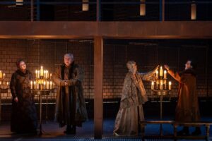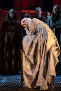 Писарев и его постановочная команда не отказываются от эпохи Ивана Грозного, но вместе с тем так уж особенно на ней не настаивают. Костюмы Марии Даниловой, к примеру, сочетают в себе приметы разных времен, включая и куда более поздние. Сценография Зиновия Марголина, проявившего себя здесь гораздо скромнее обычного, предельно условна – никакой вам исторической или иной конкретики. Даже стена, напоминающая кремлевскую, выполнена из каких-то прозрачных материалов. Опоясывающий сцену и становящийся одним из мест действия помост мы видели уже во многих спектаклях. Свою задачу он, впрочем, выполняет, позволяя режиссеру выстраивать мизансцены параллельно на нескольких уровнях. Мизансцены эти где-то более выразительны, где-то менее, подчас метафоричны (хотя метафоры не всегда считываются), но нередко режиссер просто идет по внешней действенной линии, не озадачиваясь так уж особо поиском «вторых планов».