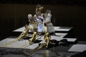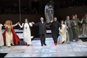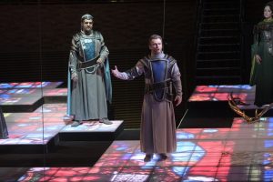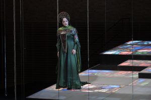 Огромные арии и диалоги. Грандиозные хоровые композиции, в том числе включающие и пение за сценой, что дает ощущение необозримых таинственных пространств за пределами зала. Фанфары, играющие с четвертого яруса, а кажется – с небес…